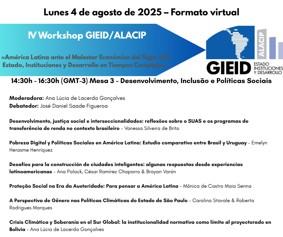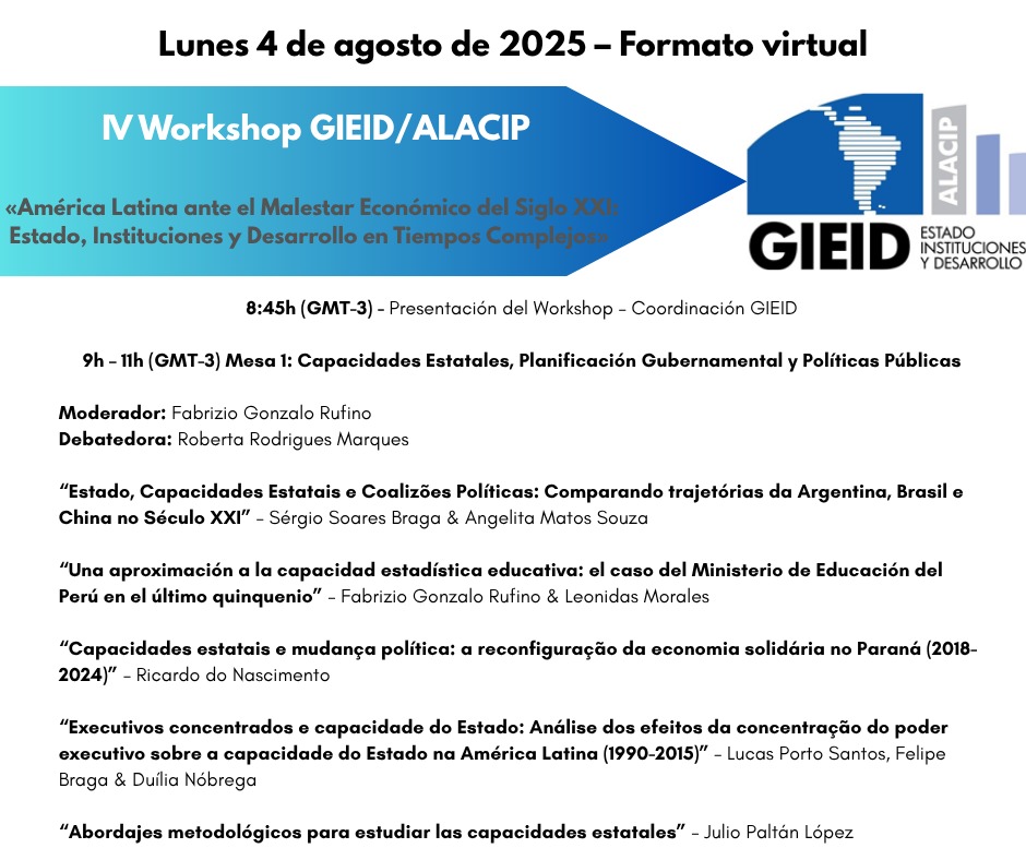 [ESP] El Grupo de Investigación Estado, Instituciones y Desarrollo de la Asociación Latinoamericana de Ciencia Política (GIEID-ALACIP) difunde a todos/as la Programación de su IV WORKSHOP, bajo el título “AMÉRICA LATINA ANTE EL MALESTAR ECONÓMICO DEL SIGLO XXI: ESTADO, INSTITUCIONES Y DESARROLLO EN TIEMPOS COMPLEJOS”, que se realizará el día 4 de agosto de 2025, exclusivamente en formato virtual a través de la Plataforma Zoom. La programación puede consultarse a continuación. Los trabajos presentados serán compilados en un Ebook del Grupo, que será publicado a finales del año.