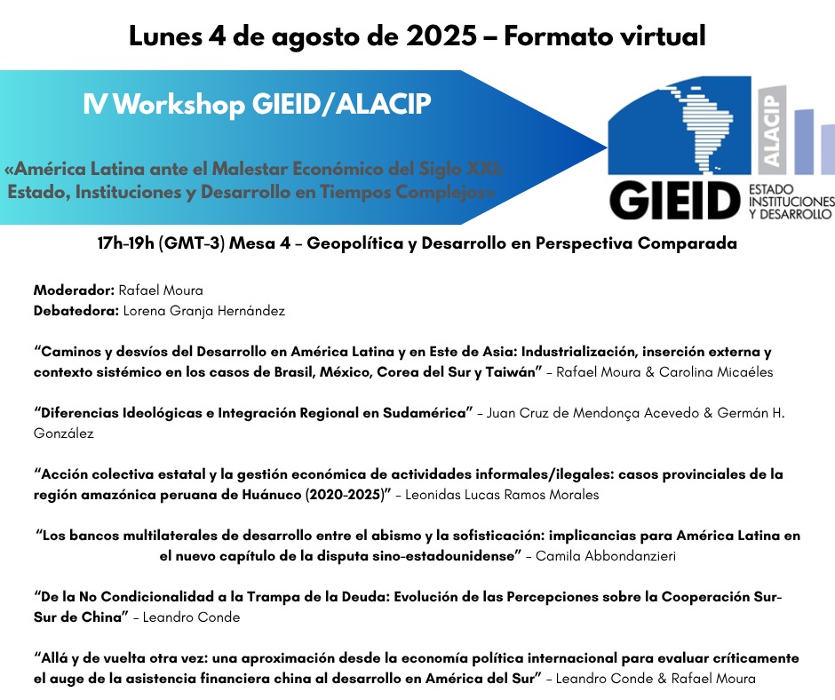 [PORT] O Grupo de Pesquisa Estado, Instituições e Desenvolvimento da Associação Latino-Americana de Ciência Política (GIEID-ALACIP) divulga a todos a Programação de seu IV WORKSHOP, sob o título «A AMÉRICA LATINA DIANTE DO MAL-ESTAR ECONÔMICO DO SÉCULO XXI: ESTADO, INSTITUIÇÕES E DESENVOLVIMENTO EM TEMPOS COMPLEXOS«, que será realizado no dia 4 de agosto de 2025, exclusivamente no formato virtual através da Plataforma Zoom. A programação pode ser consultada abaixo. Os trabalhos apresentados serão compilados em um Ebook do Grupo, lançado ao final do ano.
